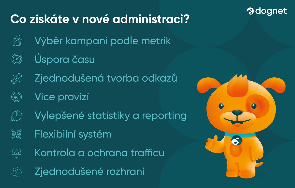 Představujeme vám novou administraci navrženou přesně podle vašich požadavků. Náš vlastní Dognet administrační systém přináší řadu nových funkcí, které výrazně šetří čas a zjednodušují práci. Nová administrace je flexibilní, přehledná a přizpůsobená vám – našim publisherům. To nejdůležitější však je, že byla vytvořena tak, aby se vám s ní snadno pracovalo a pomohla vám získat ještě více provizí.